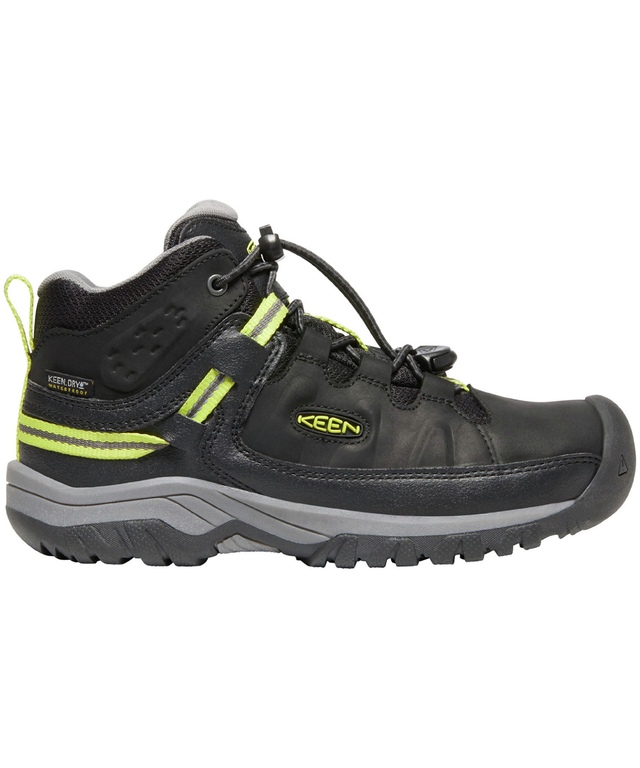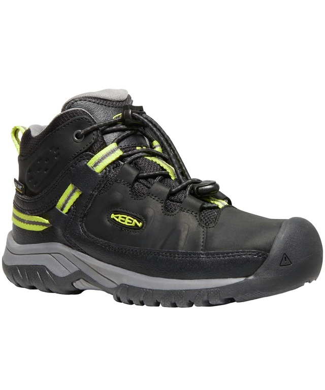 "These KEEN Kids Targhee waterproof hiking boots in big kids sizes offer mid-height ankle support, performance and traction for leading the way on family hikes and camping trips. They are tough and gritty on the trail."