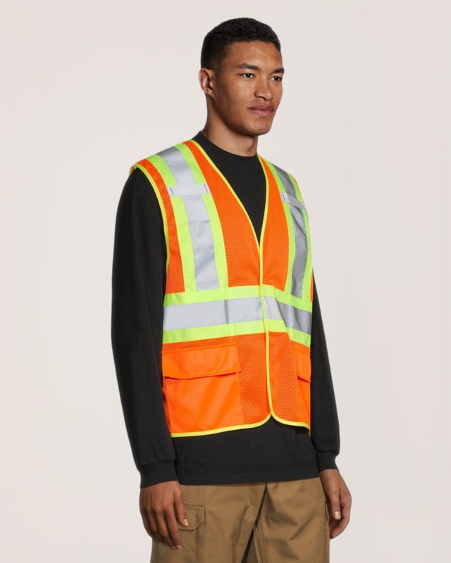 Ideal for outdoor workers on construction sites, this Aggressor Class 2 Hi-Vis Safety Vest meets appropriate Canadian safety regulations for visibility. It features roomy front pockets for small accessories and loops on the front shoulders for attaching your ID and phone.