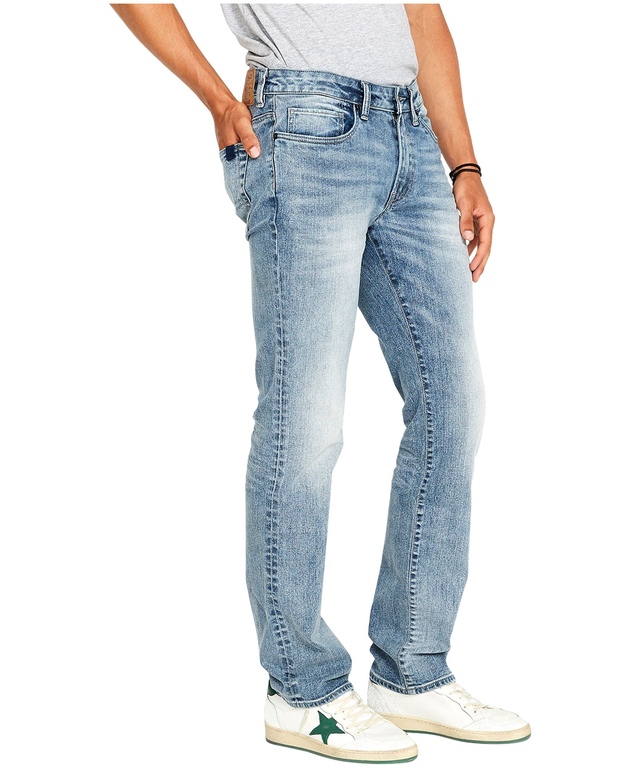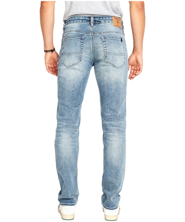 Stretch sustainably-sourced denim jeans in a blue whiskered and contrasted wash. This bestselling style features a comfortable low-rise waist with a straight leg and tapered hem. The worn design adds a rock-inspired look to a classic fit. The eco-friendly logo patch in tan and red is at the back waistband. The signature maple leaf graphic is debossed at the zip-fly.