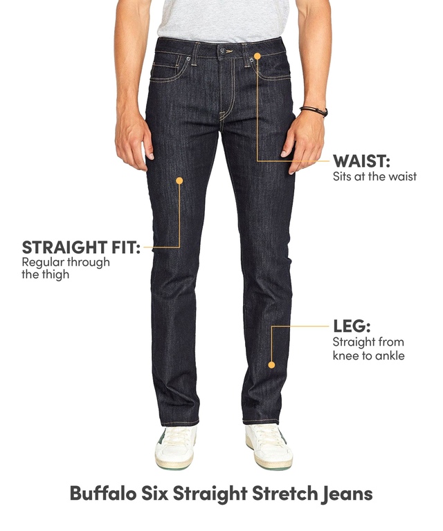 The Buffalo Six Straight Stretch jeans are fashioned in lightweight stretch denim with a washed indigo rinse. This bestselling style features a comfortable regular-rise waist with a straight leg. Part of Buffalo's Authentic Collection, these jeans offer long lasting textured denim with just the right amount of stretch.