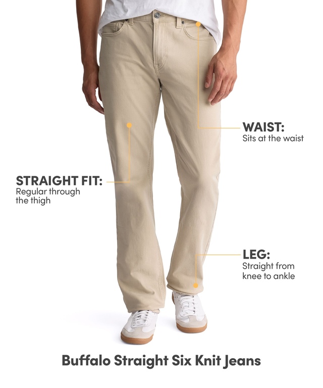 Dress it up but keep it casual. Crafted from a cotton blend that looks like an ordinary pant but is as comfortable as a fleece jogger, these Straight Six jeans are classier than your true blues but designed for ultimate comfort. Features a straight leg, regular rise, zip fly and classic denim rivets.