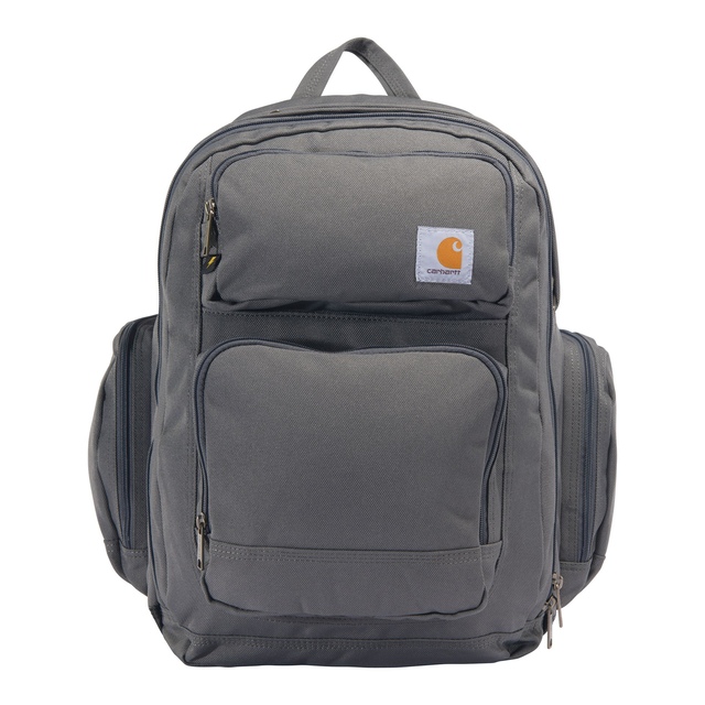 Grab this ample Carhartt backpack when you need a lot of space for your gear. The triple-compartment design includes two large main compartments with a padded laptop compartment and organizer pockets, plus a top front pocket with space for power packs and cord ports. Extra zippered pockets on the front and sides hold cords, water bottles, and small items like pens and keys.