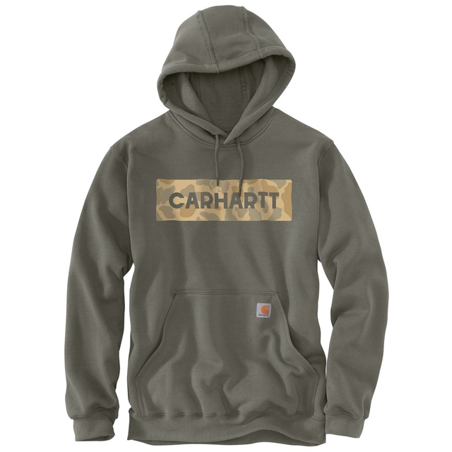 The Carhartt Men's Camo Logo Pullover Hoodie blends comfort with rugged style. Made from midweight fleece, it features a bold camo graphic on the chest. Designed with a loose fit, front handwarmer pocket, and a three-piece hood, this hoodie offers everyday comfort.