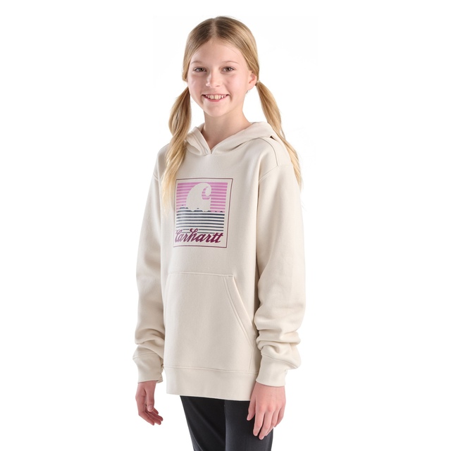 The Carhartt Youth Unisex Long Sleeve Graphic Sweatshirt is made from cozy fleece for a comforting feel and snug warmth. Featuring long sleeves to offer additional coverage. With its built-in hood and big front pocket, it provides the coverage and storage one needs when out in the world.