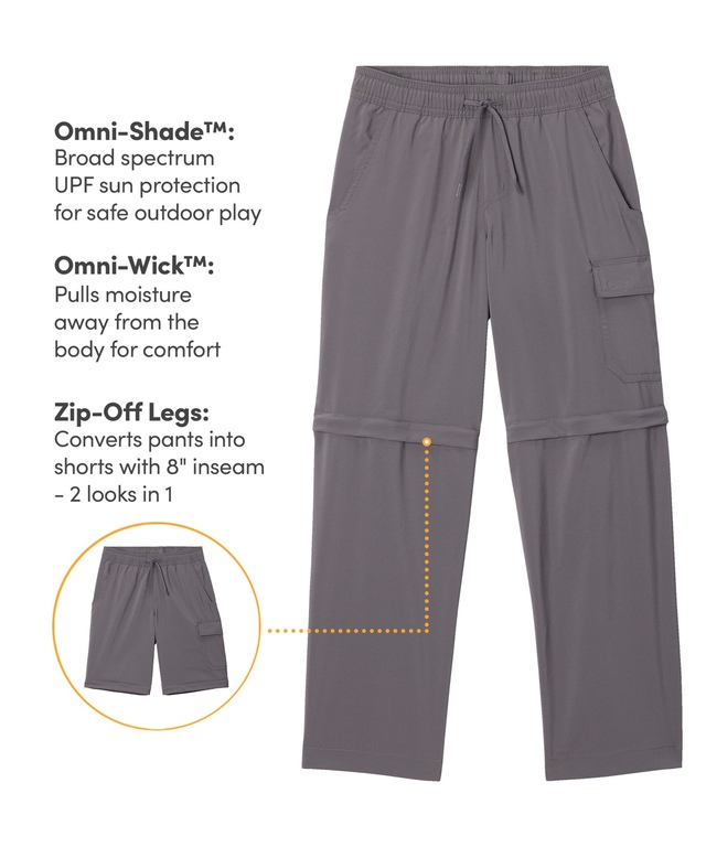 Whatever the weather or activity, these Columbia boys' convertible pants are protective as well as flexible. They shield youngsters from the sun, wick away sweat, and instantly transition from pants to shorts. Made with 100% recycled material.