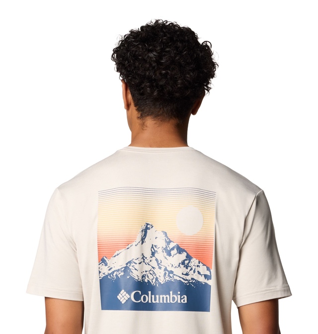 Made for summer comfort, this Columbia T shirt shields you from the sun's damaging rays and wicks sweat to keep you feeling dry. The brand's familiar logo appears on the front and there's a stunning mountain graphic on the back.