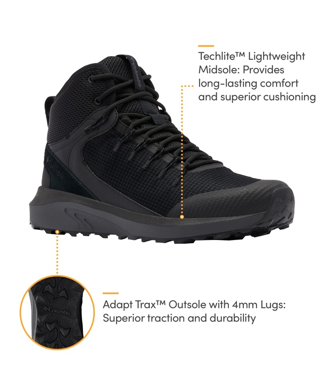 Built to take trails by storm, these Columbia boots help you move quickly, stay dry, and feel supported on tough terrain. They feature waterproof-breathable construction, an ultra cushioned Techlite™ midsole, and an Adapt Trax™ outsole with exceptional grip and 4 mm lugs for traction.
