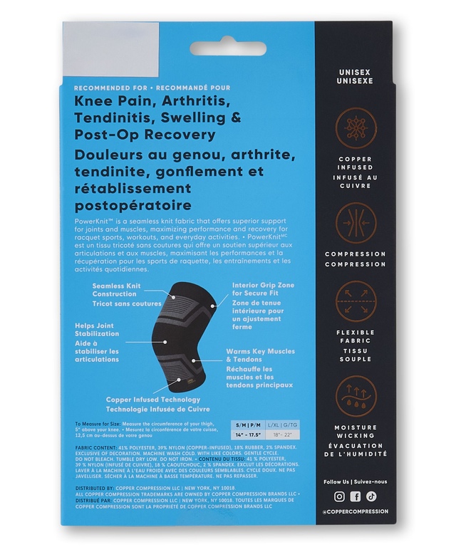 Copper Compression Men's Knee Sleeve delivers stability and comfort throughout your workout. Featuring a targeted compression on your knee joint. The design helps improve proprioception and contributes to a feeling of increased stability. The breathable material allows for extended wear, making it a great choice for your workouts.