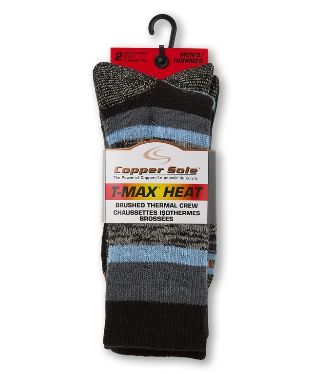 The Copper Sole Men's 2pk T-Max Heat Brushed Thermal Crew Socks come in a two-pack. The Moisture Guard™ technology wicks away moisture during activities. With a brushed inner layer, these crew socks provide complete cushioning and a smooth toe seam for extra comfort.