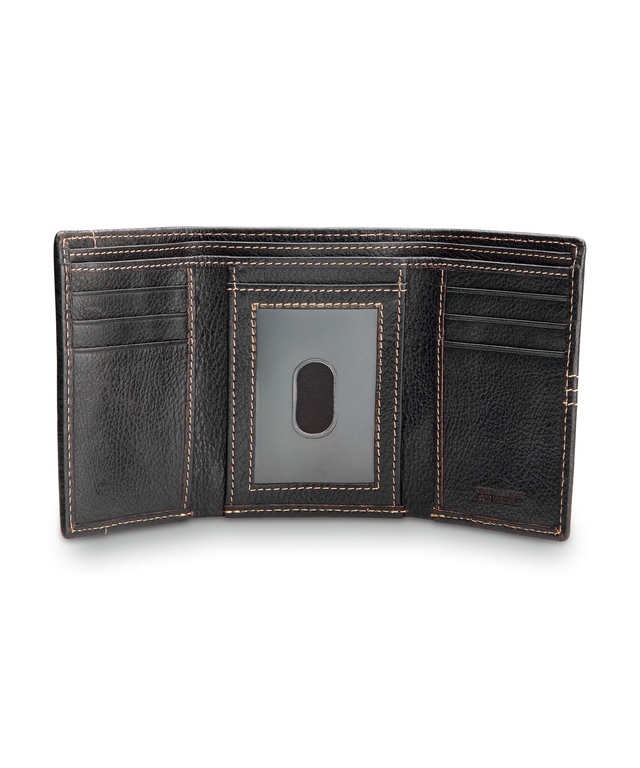 From Dakota, this leather trifold wallet safeguards your cash and cards using RFID technology. It has a money divider, an open window card holder and 8 credit card slots.