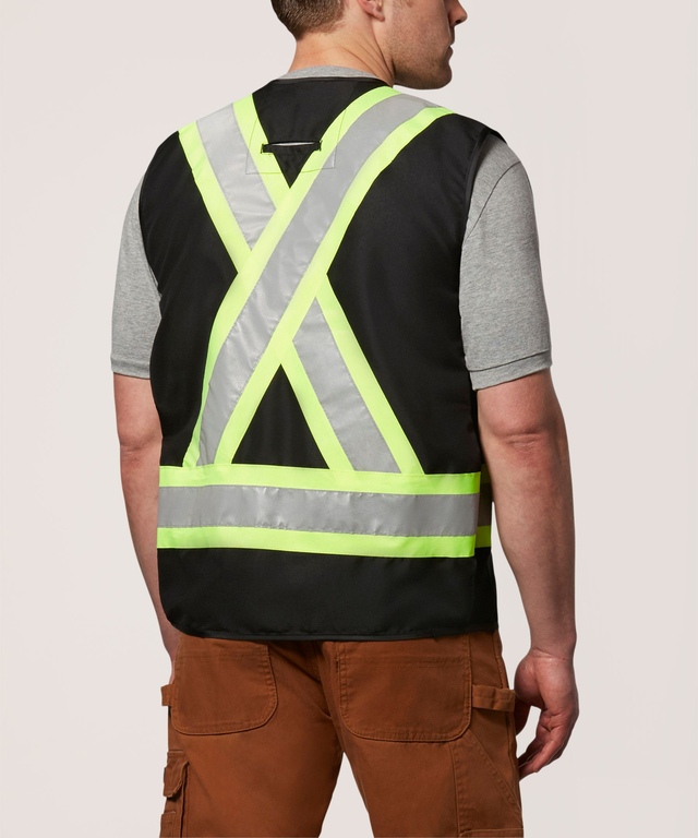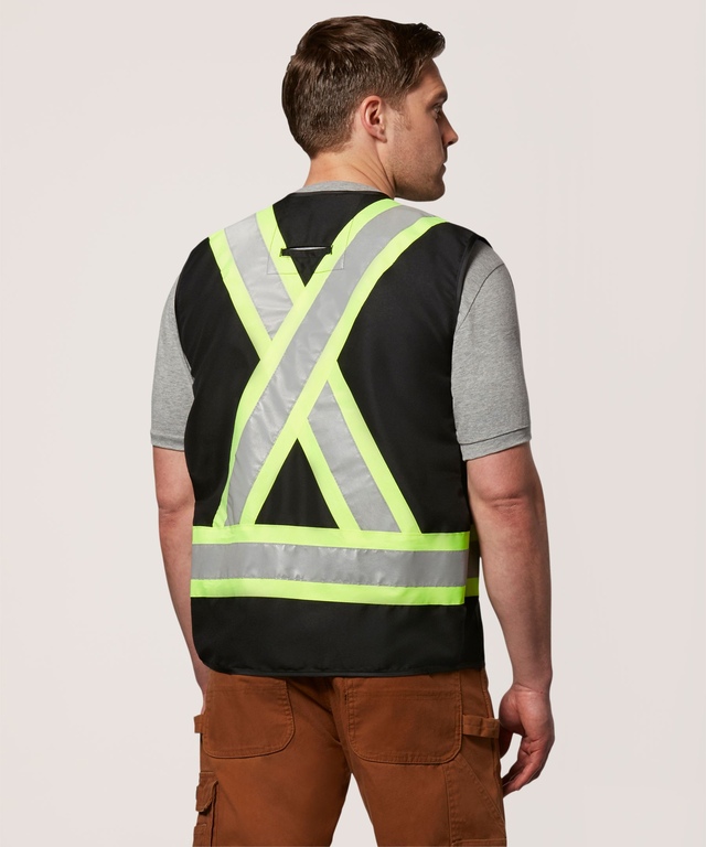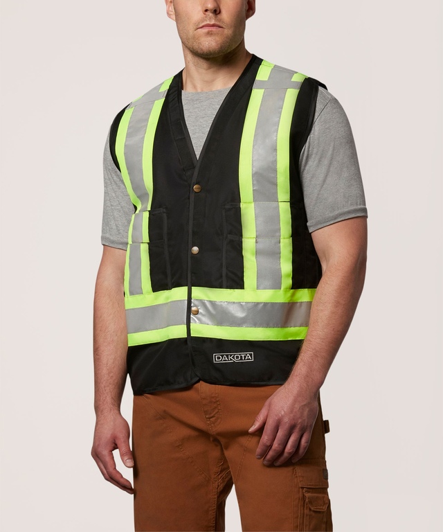 From Dakota WorkPro Series, this high-visibility vest is built tough for everyday wear on the worksite. The durable construction features reinforced stress points and seams and polyester-trimmed pockets and garment edges that reduce abrasion and fraying. The vest features mesh side vents to keep you from overheating and gussets in the sides for an expandable fit. Several pockets and pen and tool stalls allow you to keep essential work items close at hand. Fully compliant with regulations for hi-viz garments, this safety vest is ideal for construction and warehouse workers, as well as truck drivers. Model is 6'1-1/2" and he is wearing this safety vest in size Large.