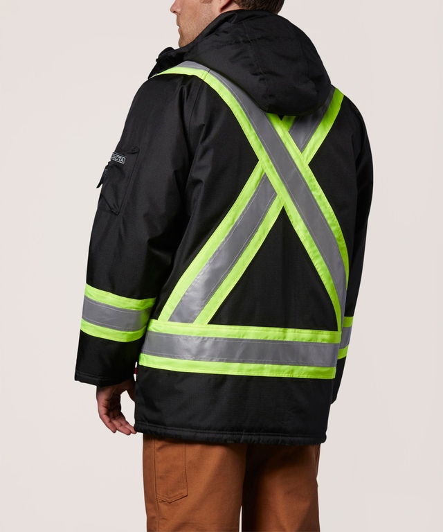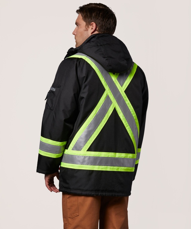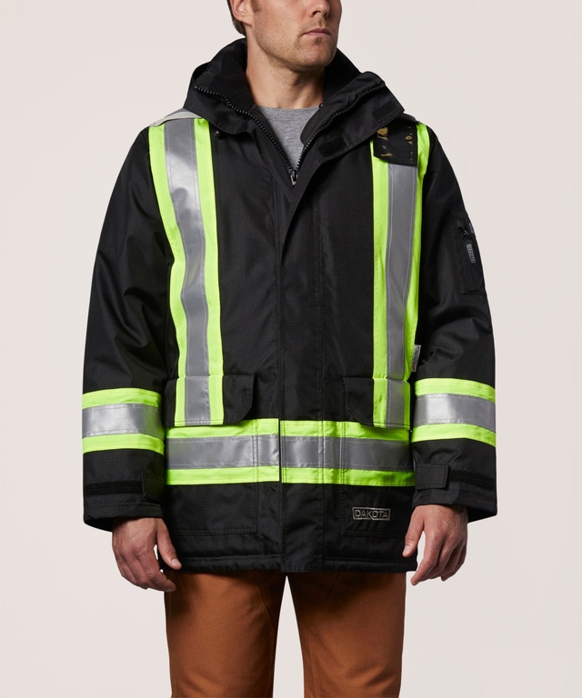 This Dakota WorkPro Series high-visibility parka is treated with HYPER-DRI HD3, making it waterproof and breathable for dryness from the inside out. It has a three-piece detachable and insulated peaked hood featuring an elastic draw cord with barrel-locks for full head protection. Fully lined and insulated, this coat features a storm flap-protected front zipper and underarm grommet vents for body heat regulation. Equipped with plenty of pockets to store small work tools and other essentials, this jacket features bold safety striping, making it an ideal companion when you're working outdoors in the winter.
