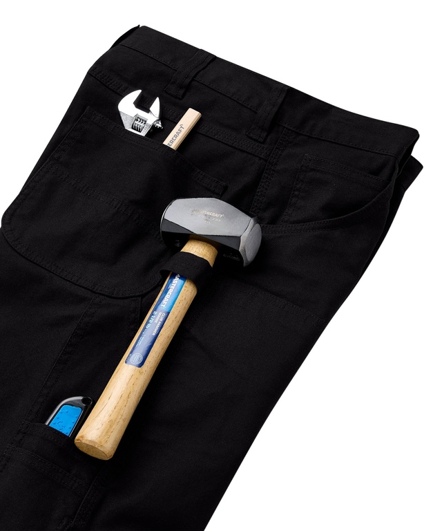 PLACES TO STOW YOUR GEAR: Cargo pocket with outer cell phone pocket and double pencil stall on left leg. Triple tool pocket on right leg designed to pull away and prevent objects from making contact with leg. Hammer loop on each leg