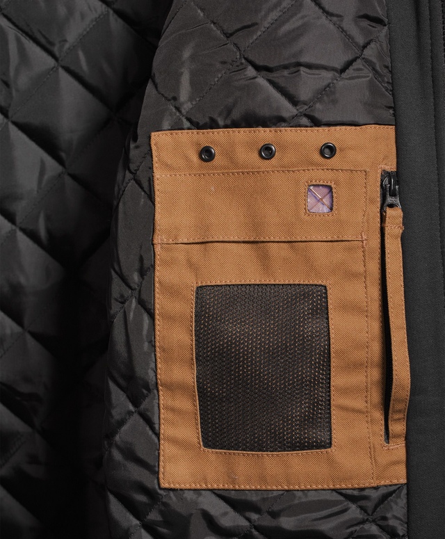 PLACES TO STOW YOUR GEAR: Large lower front patch pockets with concealed zippered security pockets inside patch pockets, cell phone pocket and vertical zippered pocket with cord pull on inside left chest, double pocket inside right chest and 2 large mesh storage pockets inside bottom front of jacket