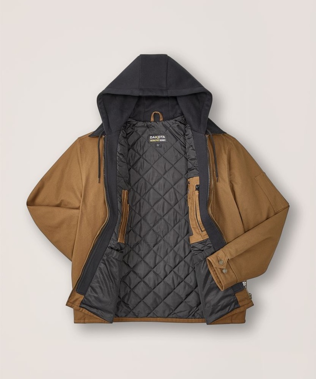 Keep comfortable and warm all day long with the protective T-MAX insulation of the Dakota WorkPro Series bomber jacket. It keeps your core temperature up without overheating when you start to move around. It has a three-piece hood with an adjustable draw cord to get the fit just right, while the quilted TMAX lining keeps you warm without the bulk. It comes with plenty of secure pocket options to store your workday essentials with a dedicated internal chest pocket to keep your cell phone within easy reach. Customize the fit with the two button adjustable sleeve cuffs and waist tabs, or put the corduroy collar up to keep the wind away. It's a versatile layering jacket that looks good enough to take you from work, to a casual get together with friends.