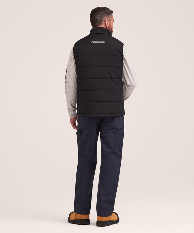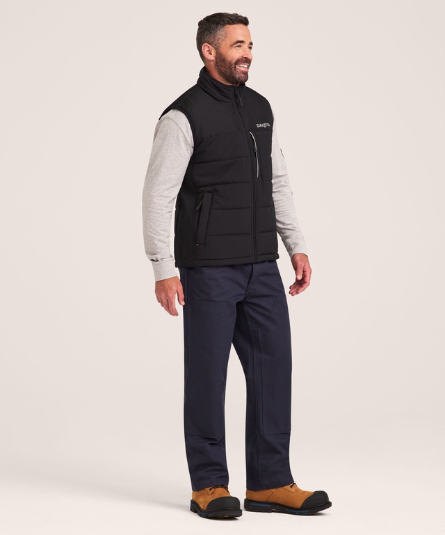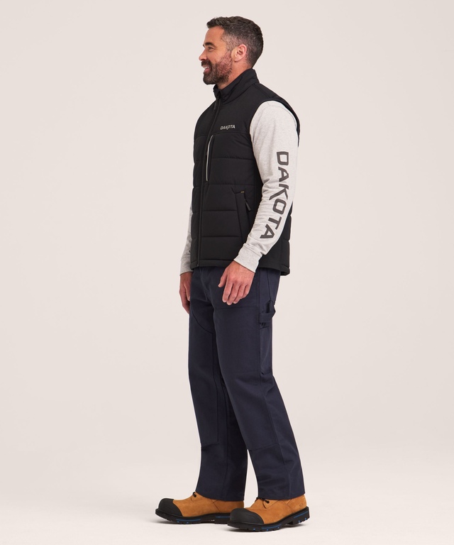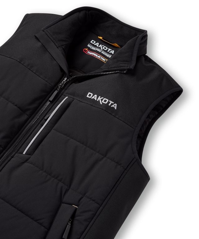 Gear up for cold fall and winter days on the worksite with this Dakota WorkPro Series Thermalectric vest. The vest is made with a durable high density shell fabric, and it’s filled with T-MAX® INSULATION for superior warmth and maximum comfort. The high collar helps to shield your neck from the elements, and it has a chin guard to minimize irritation. Details like a heavy-duty front zipper and reinforced shoulders help the insulated vest stand up to everyday wear and tear, while rib-knit side panels provide a more comfortable fit. Zippered pockets on the front and a snap-closed interior pocket provide plenty of secure storage for essential items.