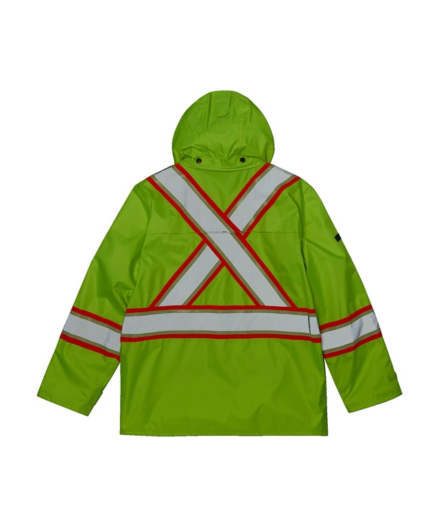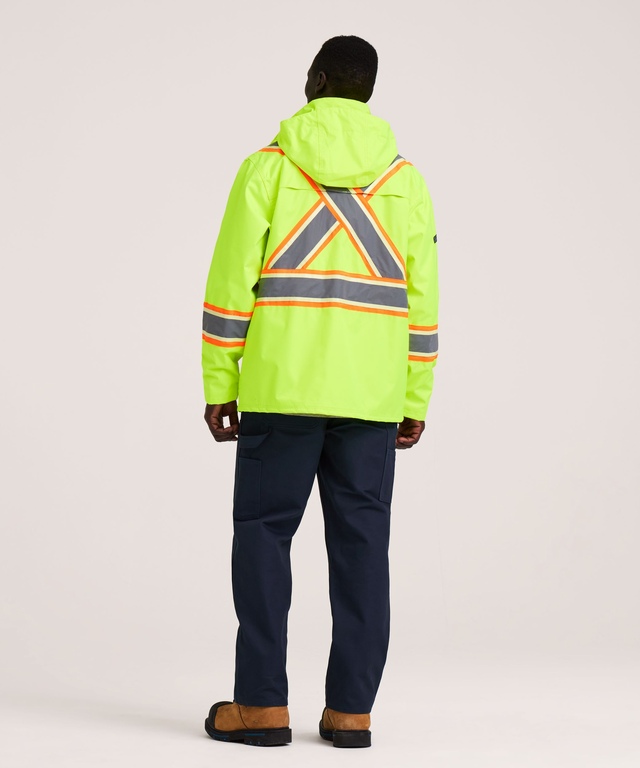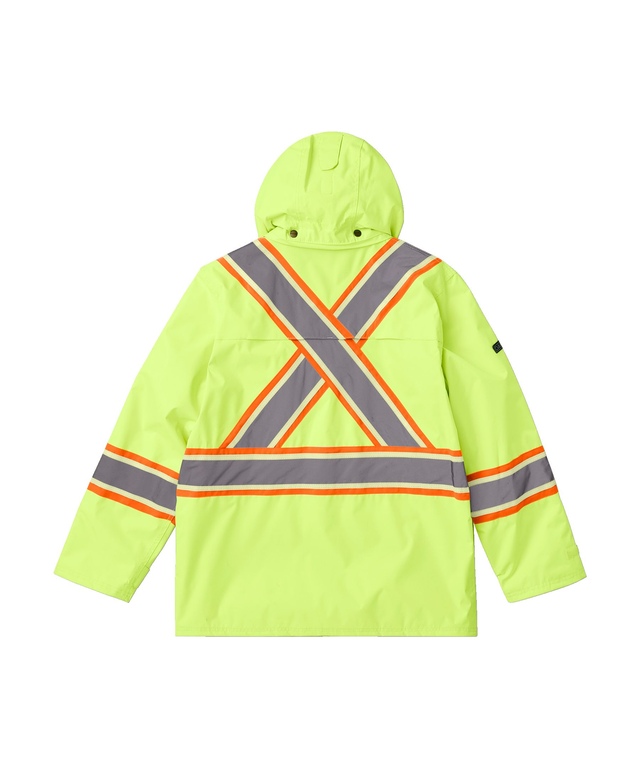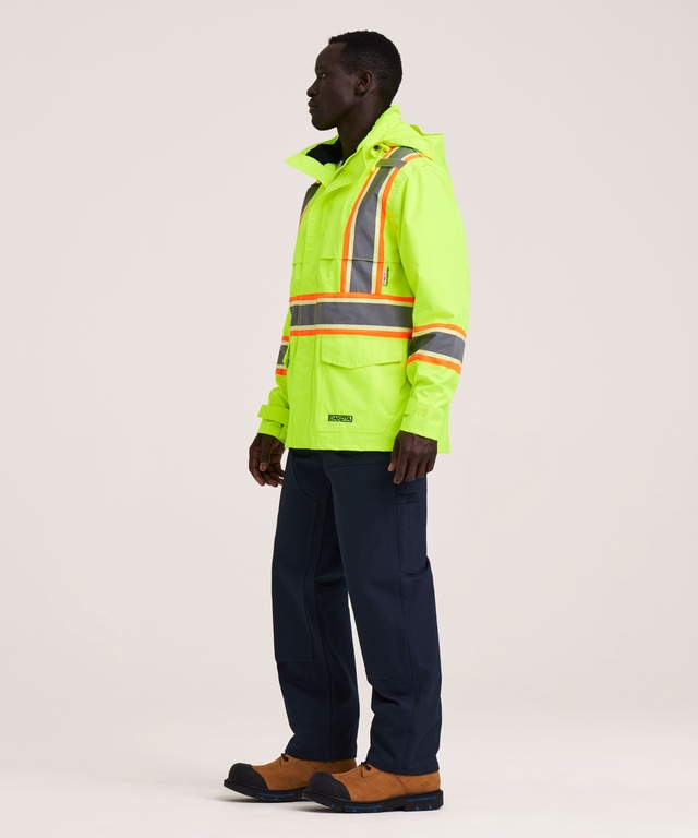 Our Dakota WorkPro Series safety jacket is made of waterproof ripstop fabric offering superior tear resistance. It remains flexible in cold and wet conditions. The jacket is mesh-lined in the body for breathable comfort. When the weather permits, you can easily detach the three-piece peaked hood. For weather sealing, this jacket features a heavy-duty zippered closure between inner and outer storm flaps and adjustable wrist straps. Fully compliant with WCB, Worksafe, DOT, CSA and BC MOT safety requirements for visibility, this VizLite™ Dual Technology work jacket has multiple storage spots for the gear you carry with you on the job. Full details are covered in the accompanying feature box.