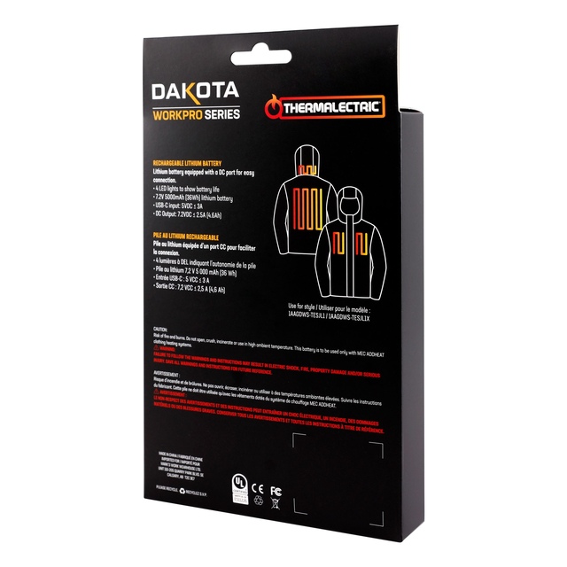 To keep your Dakota WorkPro Series Thermalectric Jacket working hard, we offer this replacement battery. Fully charged, it powers your coat for approximately four hours.