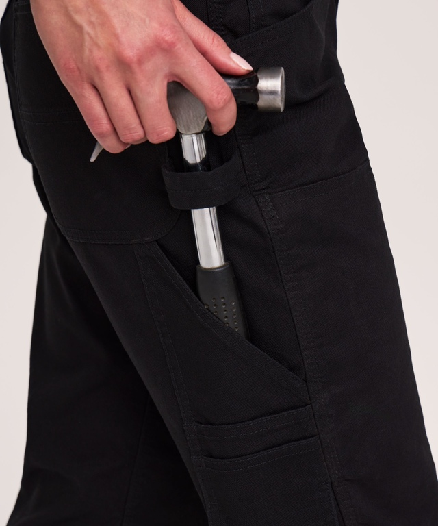 These work pants are specially designed for women working in the trade and feature all the durability you expect from duck fabric with added stretch.They have a gusseted crotch and articulated knees for better mobility when bending, and a zippered opening where you can insert knee pads. Cargo pockets, including double pencil stalls on the left leg, give you plenty of room to store your tools and keep your cell phone close at hand. The right tool pocket is designed to keep stored objects from making contact with your leg, while the back pockets feature an extra layer of fabric for increased durability.