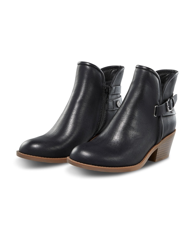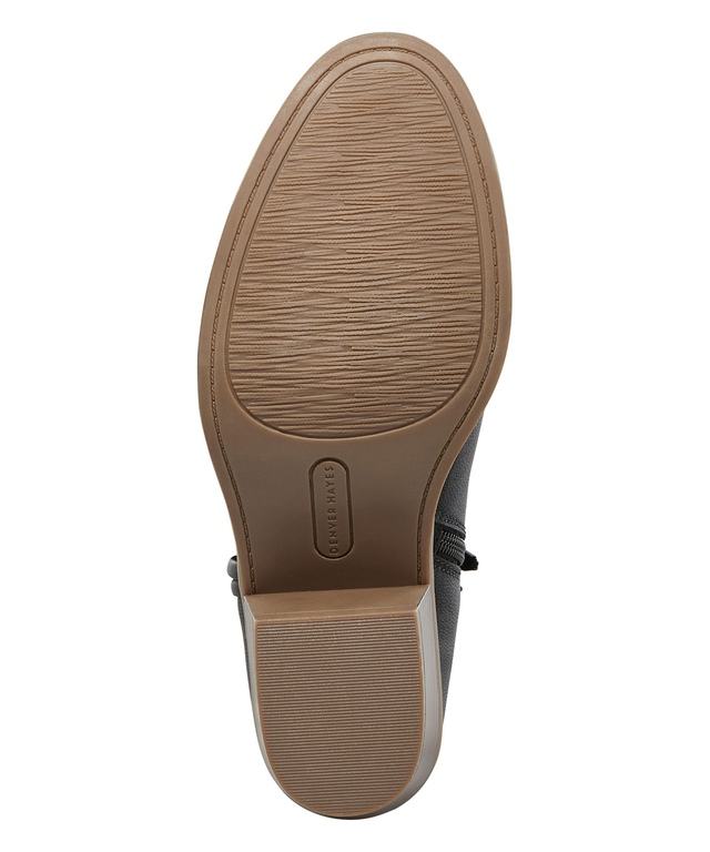 Our Denver Hayes Justine Ankle Boots have a bit of a Western vibe. Featuring a wrapped back strap with a metal buckle and decorative rivets, they have an inside zipper that makes them easy to pull on and off.