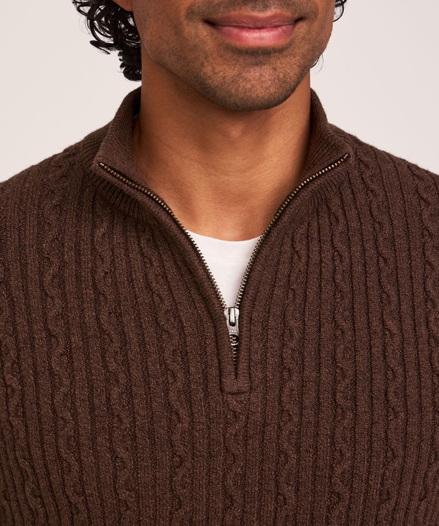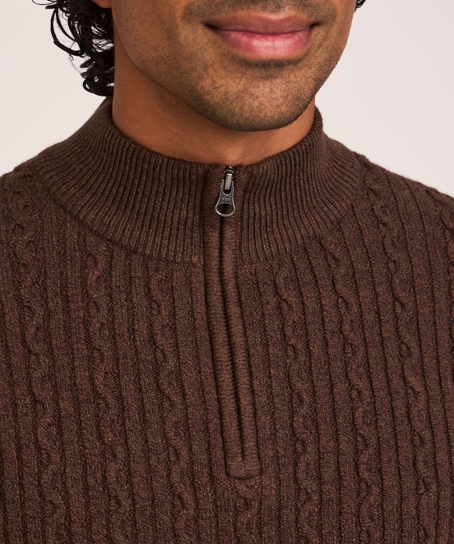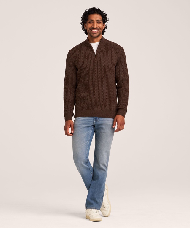 Featuring a classic cable knit design, this Denver Hayes sweater is a smart choice for everything from a day at the office to winter recreation. The versatile mock neck sweater is made with a soft, lofty yarn to help keep you warm and comfortable in the fall and winter months. A quarter-zip closure makes it easy to pull on quickly before you head out.