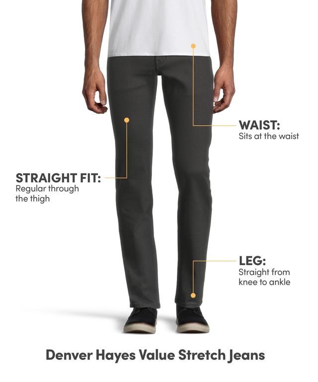 Featuring straight legs that always look right, these Denver Hayes stretch jeans come in a grey wash with all the typical jean features you’d expect. They have five-pocket styling, a zippered fly and contrast topstitching.