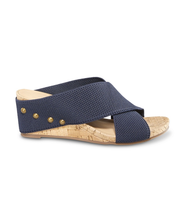 A unique and stunning design from Denver Hayes, these Elenaa Wedge Mules are sure to enhance any summer outfit. With wide comfortable cross straps, and lightweight cork midsoles, these sandals are finished with metal studs on the wedge heels.