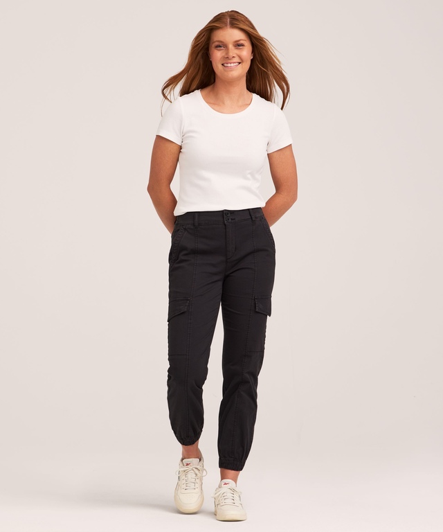 These cargo joggers from Denver Hayes are made in a woven fabric with a touch of stretch for ease of movement. They have elastic in the back waist for a added comfort.