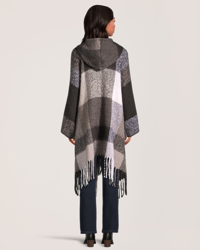 Our Denver Hayes shawl-style ruana has a hood, making it that much more versatile. We also added pockets to this design so you can carry your small essentials on your travels.