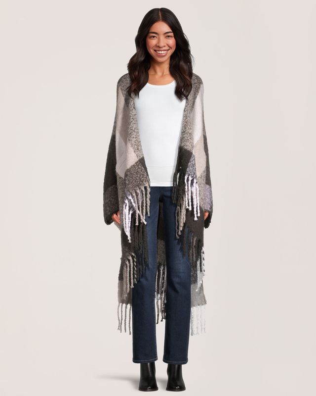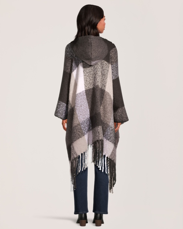 Our Denver Hayes shawl-style ruana has a hood, making it that much more versatile. We also added pockets to this design so you can carry your small essentials on your travels.