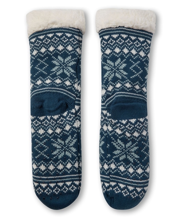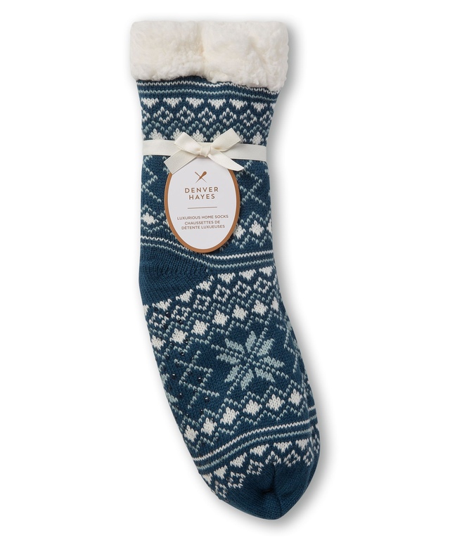 Knitted in a Jacquard pattern, these Denver Hayes socks offer warmth and comfort. A second layer of warmth with faux sherpa feels soft against your bare feet. Silicone sole grippers make it safer to walk on slick flooring.