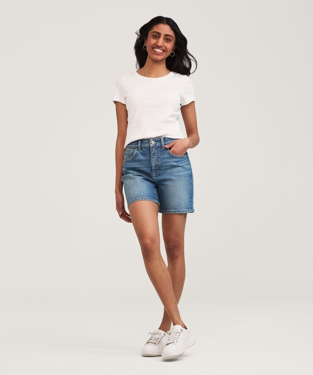 Our Denver Hayes women’s high-rise mid-length Jeans shorts have just the right amount of stretch to contour and shape your curves. The combination of the contoured waistband and innovative tummy slimming front pockets enhance your figure.