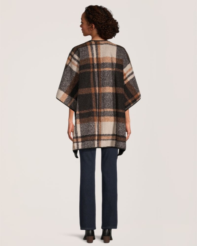 REVERSIBLE RUANA: Plaid fleece on 1 side and solid bouclé fabric on the reverse