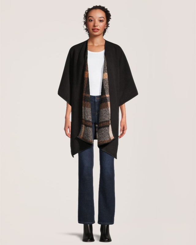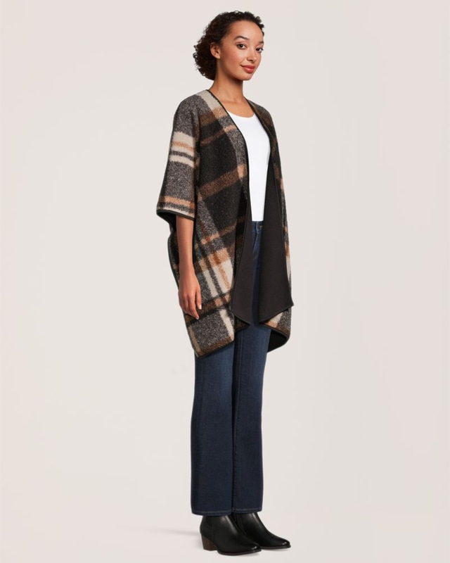 Our Denver Hayes Ruana makes a comfortable wrap for cooler days. Reversible for two separate looks, it has a plaid polar fleece layer and one made in a solid colour bouclé fabric. The versatile ruana can be worn both indoors and out.