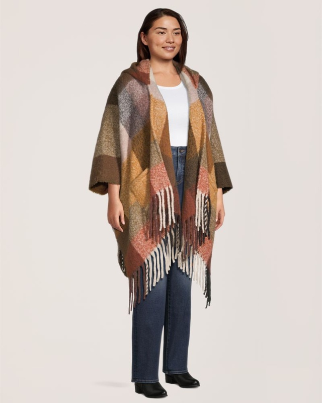 Wrap yourself in warmth and comfort with our Denver Hayes shawl-style ruana, complete with a hood and pockets for the things you like to keep close. It's the perfect cover-up to take with you throughout your event-filled day - you never know when you may suddently feel a chill.