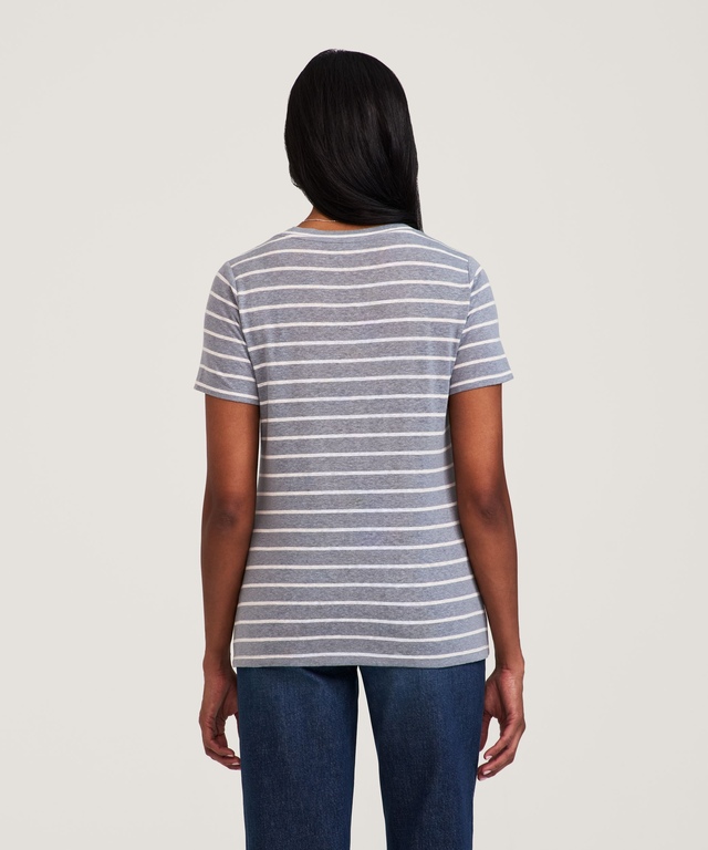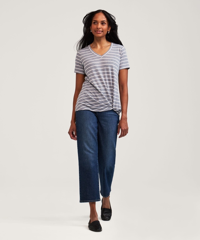 Denver Hayes added a little more style to this T shirt with an off-centre knot at the front. Made with a linen blend for breathable comfort on a hot summer day, this stylish tee looks perfect paired with your seasonal pants and shorts.