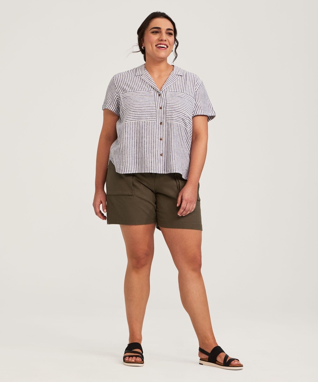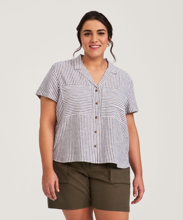 Perfect for warm summer days, this Denver Hayes linen-blend shirt is naturally breathable. The open-neck camp collar looks neat and feels comfortable. Pockets with horizontal stripes add extra style to the practical design.