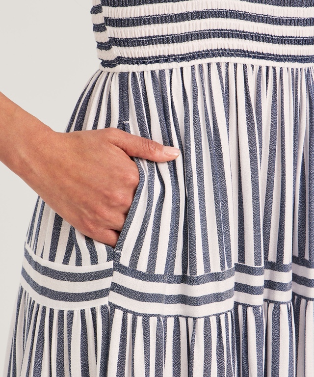 Head for the beach or any other summer activity in our delightful FarWest sundress. This design has a fitted smocked bodice and the shoulder straps are adjustable for a personal fit. Vertical stripes interspersed with horizontal bands create a great look that elevates the style.
