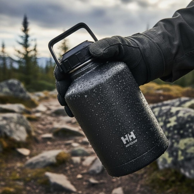 Keep your beverages cold and delicious in this Helly Hansen stainless steel Growler bottle. It features double-wall vacuum insulation. Easy to carry with a folding handle and easy to fill with a wide mouth opening.