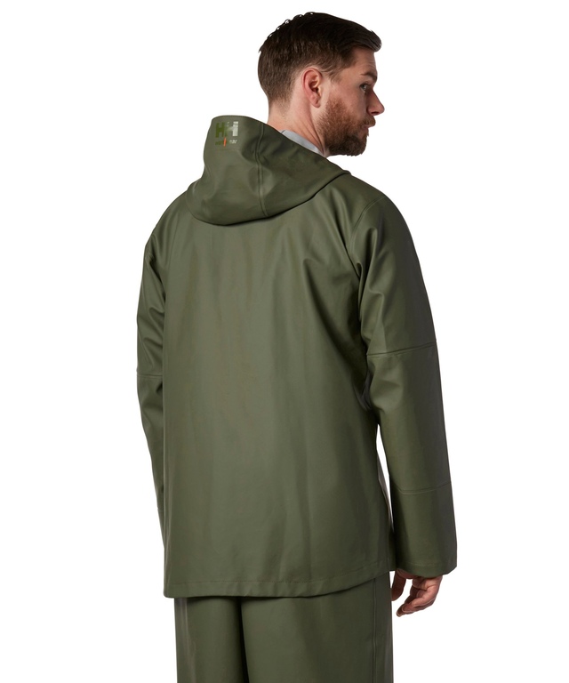 From Helly Hansen Workwear, this storm rain jacket is designed to keep you dry when you work outside. The hood is adjustable and the jacket is longer at the back to keep you covered through bending and stretching. It has a zippered Napoleon pocket that opens vertically and it features a hole for your media wire. There's also an inner pocket and an ID card loop. A double-fabric storm placket over the front zipper stops the rain from seeping in. Christopher is 6'3" tall and he is wearing this rain jacket in size Large