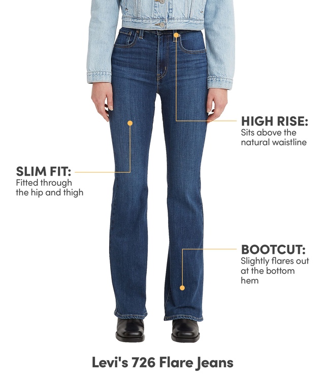 Levi's 726 High Rise is designed with a slim fit through your hip and thigh before flaring at the knee. Features a waist-nipping high rise and finished with a flared leg to elongate your silhouette. The Levi’s Sculpt fabrication with Hypersoft provides enhanced comfort with supportive stretch