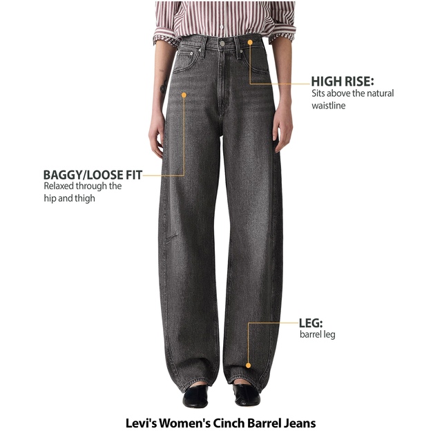 The Levi's Women's Cinch Barrel Jeans feature the traditional baggy denim style without the waist gap. Designed with a flattering high rise and curved legs, these barrel jeans feature back adjusters for a customized fit that accentuates every curve.