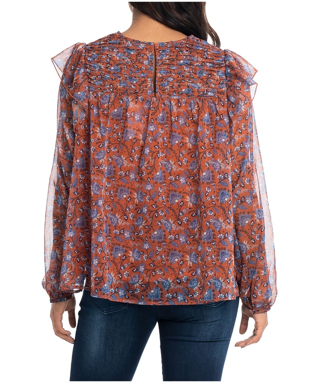 This airy sheer blouse LEANA features a beautiful floral pattern in dark tones for fall. Long puffed sleeves with ruffles at shoulders and front pleated yoke.