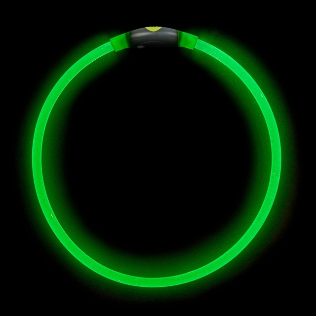 The Nite Ize Nitehowl® Rechargeable LED Safety Necklace in green keeps your dog seen and safe. It easily slides over your dog's neck as a bright addition to their collar, providing 360 degrees of illumination. It features glow and flash modes, is weather-resistant, and can be cut to fit. The necklace recharges using a USB-C cable in 1.5 hours and has a run time of 5 hours.