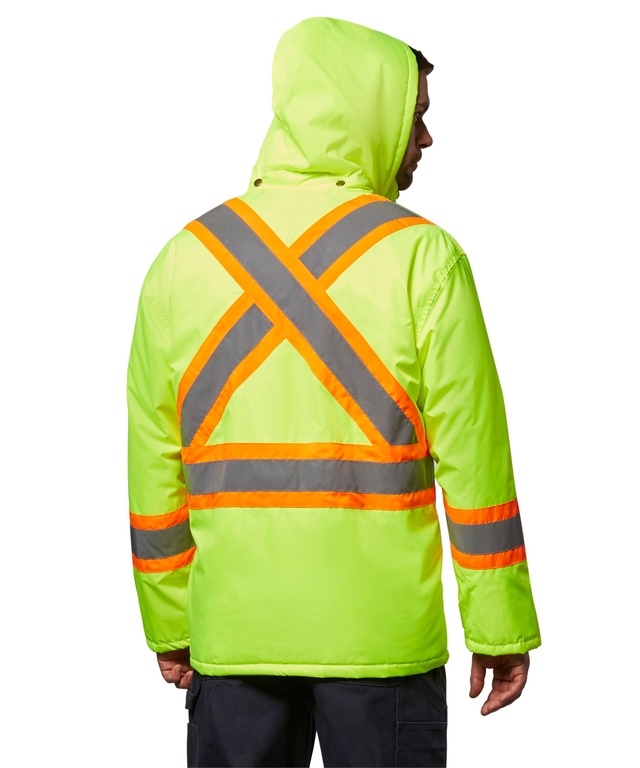 This hi-vis insulated jacket is constructed in a lightweight ripstop fabric that remains flexible, even in cold weather conditions. Windproof and waterproof to keep you dry, the men's work jacket also keeps you warm when temperatures get as low as -30°C. The hood is detachable and the collar is lined with micro-fleece to add warmth around the neck. This jacket is CSA Z96-15 Class 2, Level 2 compliant. And, if you wear it with the coordinating bib pants (available separately), it's Class 3 compliant.