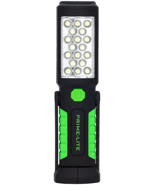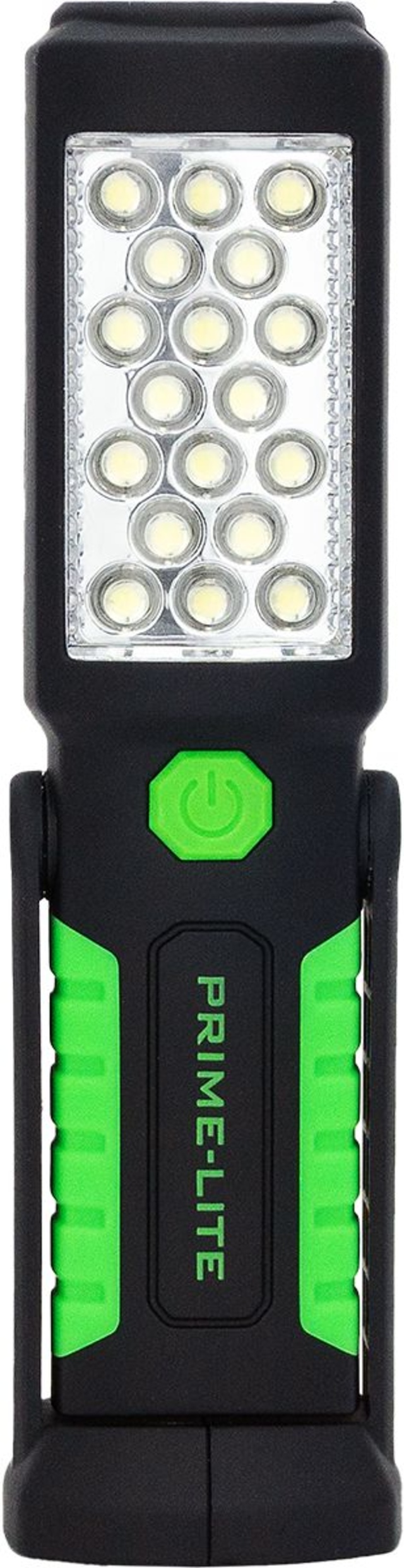 Prime-Lite's mini worklight is the ideal size to keep in your pocket or tool bag. 18 front-facing LEDs provide clear and bright light, while the top LEDs allow you to conserve energy and use it as a flashlight. The magnetic back and 180-degree pivoting base allow flexible hands-free usage, and should there not be a magnetic surface available, simply pull out the rotating clip to hang it.