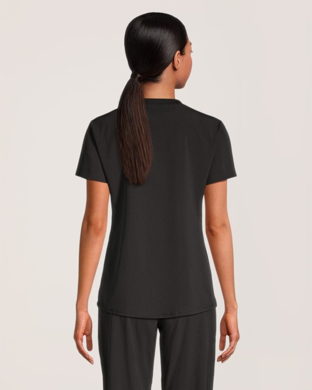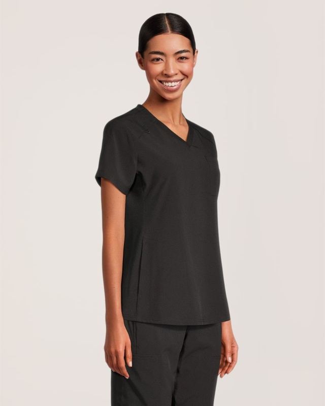 Offering a contemporary fit, this Scrubletics scrub top features rib-knit side panels for easy movement. The cap sleeves and front yokes give it a flattering look. Three pockets take care of your everyday items and there's a bungee loop for your badge clip.