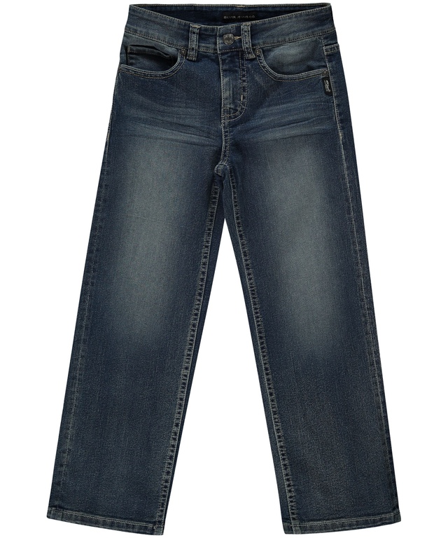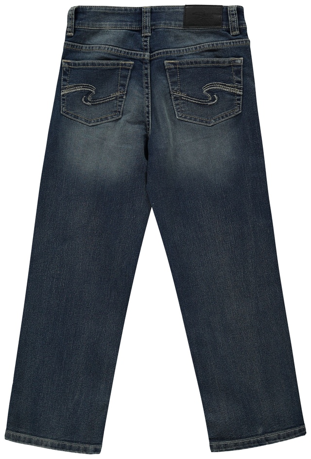 These Silver kids' loose fit jeans feature a dark wash and subtle distress details for that coveted lived-in look. The iconic Silver Jeans scroll stitching appears on the back pocket. They're perfect for junior hockey players and every other kid on and off the ice.