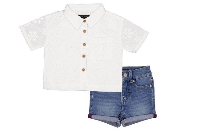 Featuring a cute eyelet top and denim shorts, this Silver set is ideal for everyday activities. Kids will love the comfort and the look as soon as they put top and bottoms on in the morning.