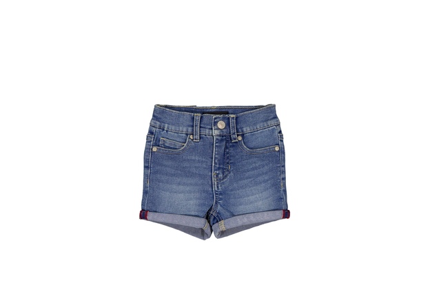 Denim Shorts: Classic 5-pocket design, zippered fly/button closure and rolled cuffs